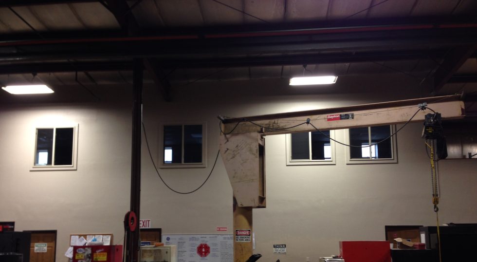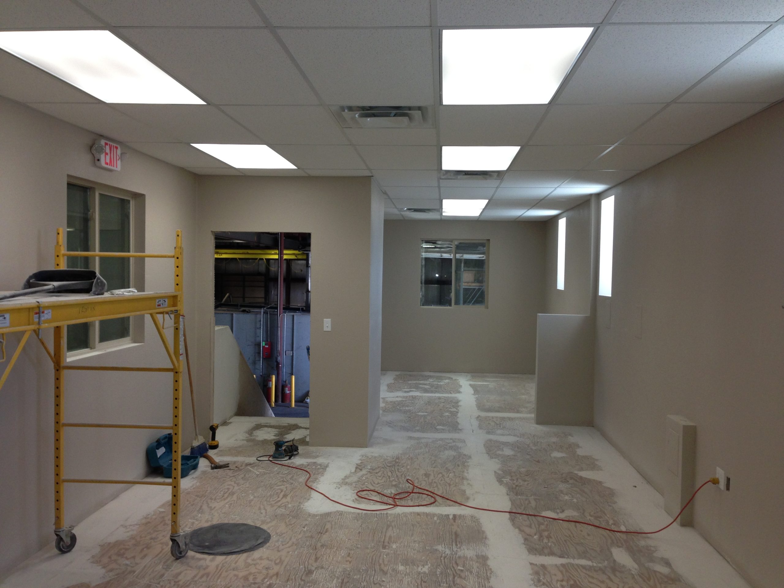 Design/Build – Renovation of 815 sf mezzanine into full finish offices and breakroom. The new space was finished with drywall, paint, VCT flooring and 4″ rubber base, acoustical drop ceiling and fixed countertops for the workstations. Interior glazing was installed in the common wall of the new workspace on 2nd floor and the shop. The breakroom included casework and tying into the existing plumbing on first floor for the new breakroom sink and dishwasher. The expansion of tempered finish area required additional H.V.A.C., completed with a split system. Additional emergency egress exit was required in addition to existing staircase. New set of stairs was constructed of wood framing, finished with oak wall cap and handrail. Once on site the project scope expanded with owner driven additions, including upgrade warehouse, and covered loading area lighting.
