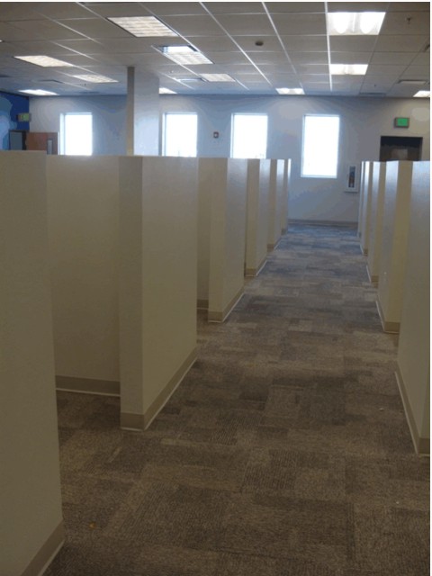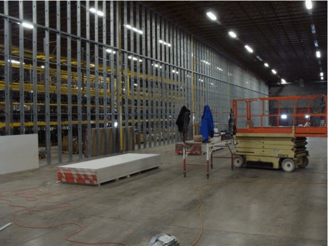 Warehouse – Included demo for the exterior overhead doors and man doors in the tilt-up concrete walls. Removal of existing electrical/lighting and replaced with energy efficient lighting, Installation of one (1) evaporative cooler and fire sprinkler system throughout the 23,888 sf warehouse area. Work included removing existing louvers/vents in the tilt-up walls and replacing them with approximately 130 sf of architectural panels.