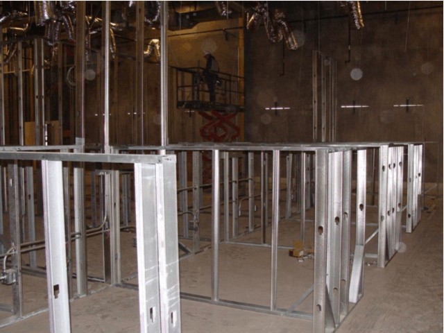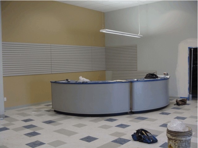Office Area – Construction included a full finished office area demo for the exterior doors/windows in the tilt-up concrete walls, removal of concrete slab for the proposed 20 plumbing fixtures, installing five (5) roof top units, electrical, fire sprinkler system. The office area included 20 offices, breakroom, restrooms, training room, copy center, reception center, and show room with carpet, ceramic tile, acoustic ceiling, doors, casework, and countertops. Work included installing a wheelchair lift, and a 23’ x 12’ metal canopy bolted to the tilt-up walls at the new office entrance.