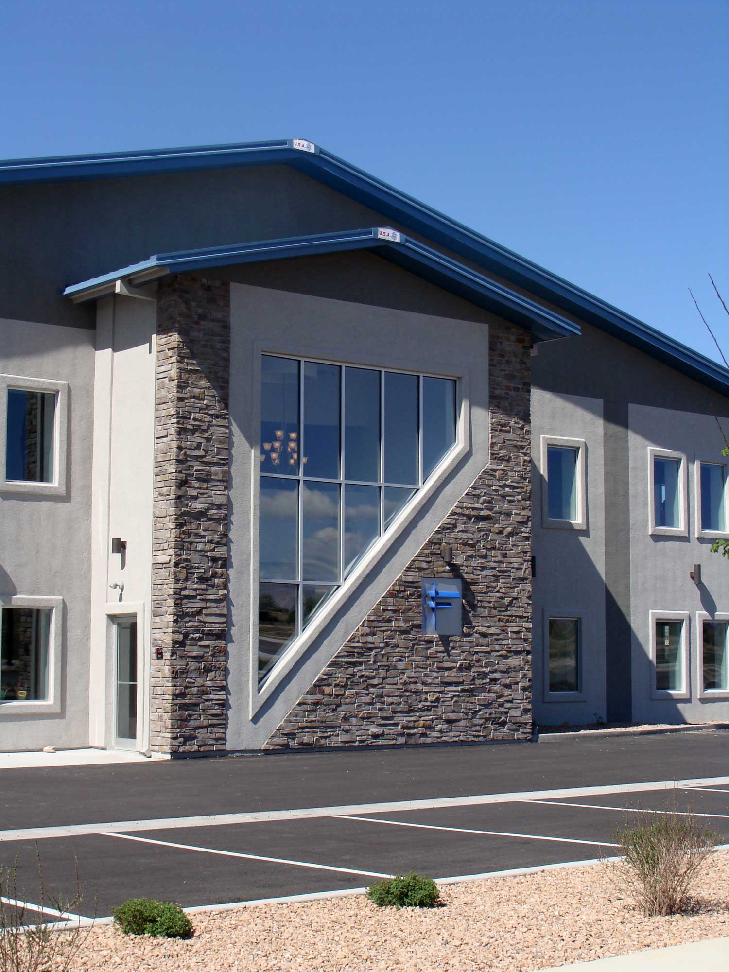 Design/Build – 11,531 sf two story office building, includes 4,942 sf full finished office on first floor, 790 sf of full finished office on second floor, 2,375 sf of unfinished area on second floor open to the 3,424 sf shop. This pre-engineered steel building features custom storefront glazing, stucco, and stone. The interior features a large indoor planter in lobby at the reception area, offices to accommodate a staff of up to 20 including full break room, conference room, storage room, IT room, copy room, and the design department. This turnkey project also included all site work and landscaping. Building is currently leased to FAA.